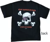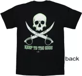 Our Pirate T-shirts are all high-quality 100% cotton, pre-shrunk shirts. Image is on back of shirt, with a small emblem on the front left chest. In stock, ready to ship!