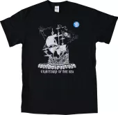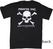 Our Pirate T-shirts are all high-quality 100% cotton, pre-shrunk shirts. Image is on back of shirt, with a small emblem on the front left chest. In stock, ready to ship! Available in Indigo or Ash (pictured).