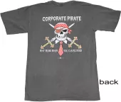 Our Pirate T-shirts are all high-quality 100% cotton, pre-shrunk shirts. Image is on back of shirt, with a small emblem on the front left chest. In stock, ready to ship!