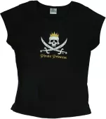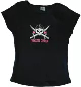 Our Ladies' Pirate T-shirts are all high-quality 100% cotton, pre-shrunk shirts. Image is on the front of the shirt, which has a baby doll design. In stock, ready to ship! Sizes for the baby doll tshirts run small.