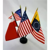 Our 4" x 6" Bennington stick flags are made from a high quality, silk-like polyester fabric. They feature a hemmed flag mounted on a black plastic 10 inch staff with a gilded spear point. These versatile stick flags can be used on tabletops and desks, to wave in parades, or to decorate flower arrangements.