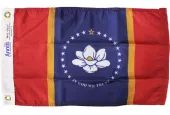 The nylon Mississippi presentation flag sets are furnished with the finest quality mountings and are suitable for any formal flag presentation. Our deluxe sets contain a beautiful, high gloss 3'x5' Nylon flag with pole hem and fringe, a furniture polished two-piece oak-finish pole that includes a solid brass screw joint, a 7.75" Fancy Spear Ornament, 5"x9' golden yellow cord and tassels, and our deluxe gold-finished Liberty flag stand. Our Presentation Flag Sets are proudly made in the USA.