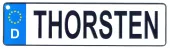 Made in Germany, these high quality embossed novelty aluminum license plates measure 10.25" x 2.75" (26 cm x 7 cm). The individual names are stamped into the metal giving the decorative nameplate an authentic European feel. Two bore holes in the upper corners make for easy display when decorating your home or office.